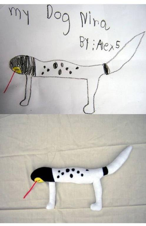 Naar aanleiding van kindertekeningen werden knuffels gemaakt van stof, je zou willen dat je zelf zo iets leuks had bedacht.